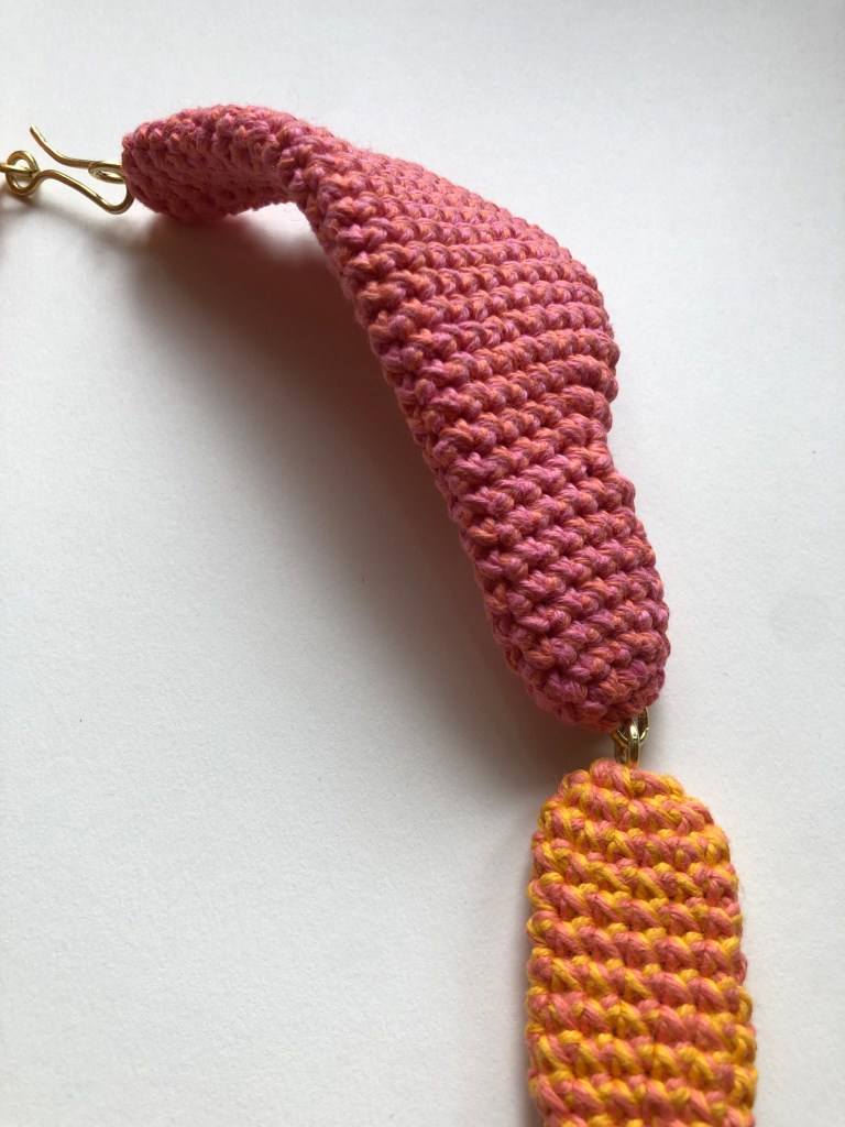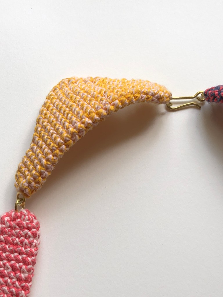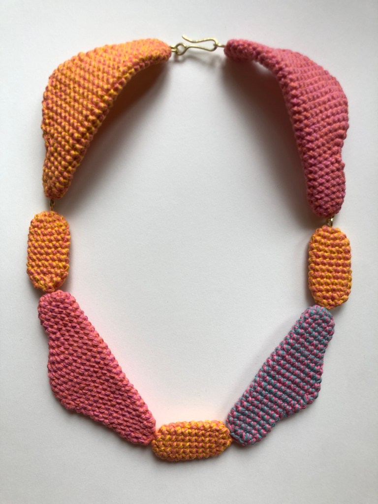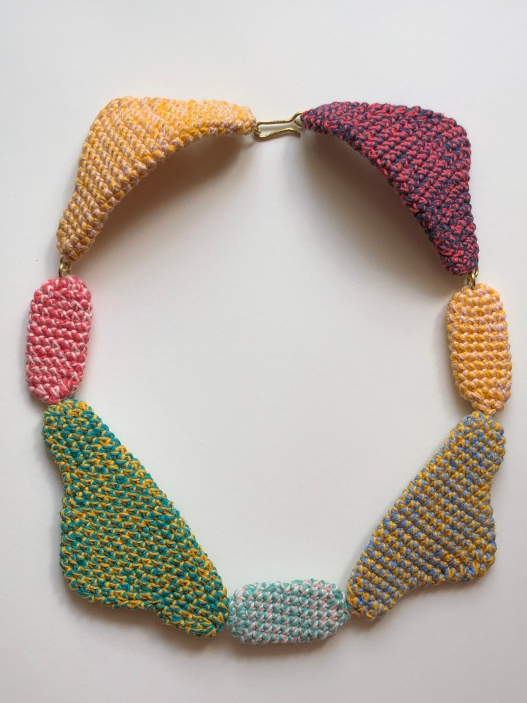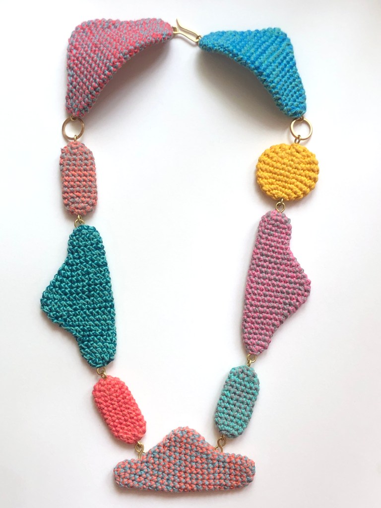“Sunset Borbona Winter” necklace; cotton, brass; 2024.