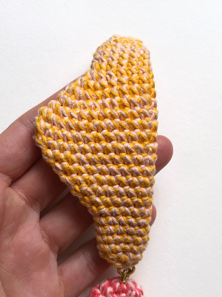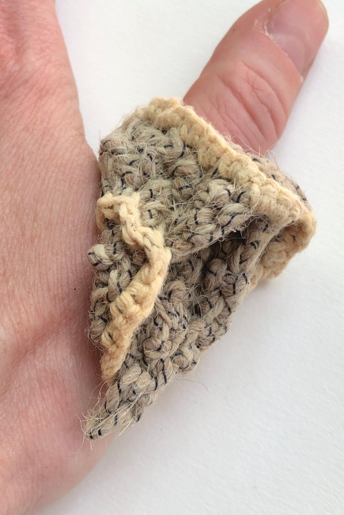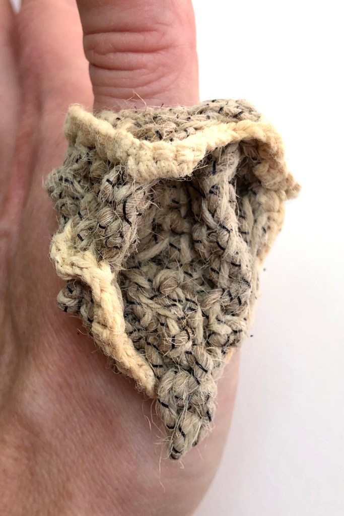cotton, jute, acrylic paint, hardening agent; ring, 2025. ca. 4 x 5 cm (top); internal size 6,5 cm.
